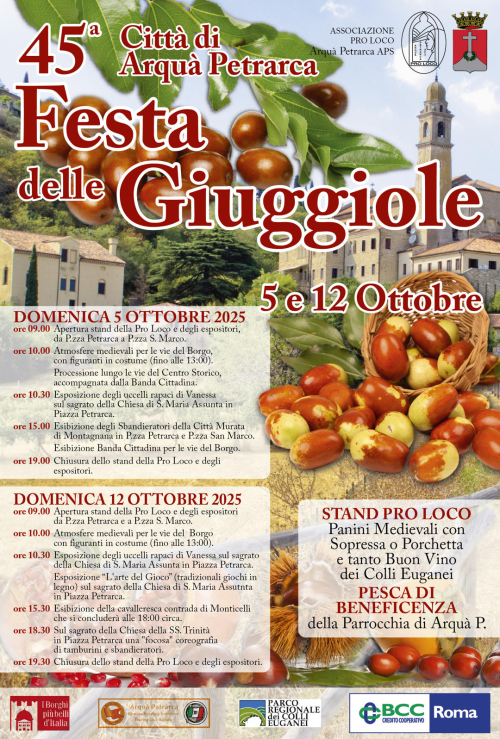 In occasione della 45 Festa delle giuggiole, le vie del borgo di Arquà Petrarca si animano con musici, giullari, antichi mestieri, falconieri, sbandieratori e bancarelle a tema.