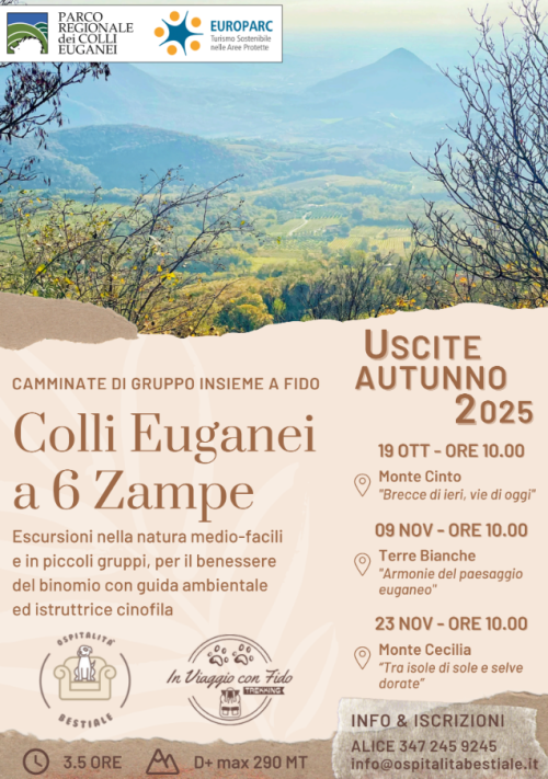 Secondo appuntamento autunnale di Colli Euganei a 6 Zampe, con camminate di gruppo insieme a Fido per conoscere da vicino il panorama e le curiosità euganee. Trascorreremo del tempo di qualità in piccoli gruppi, per il benessere del binomio (cane/proprietario), con guida ambientale escursionistica ed istruttrice cinofila.
