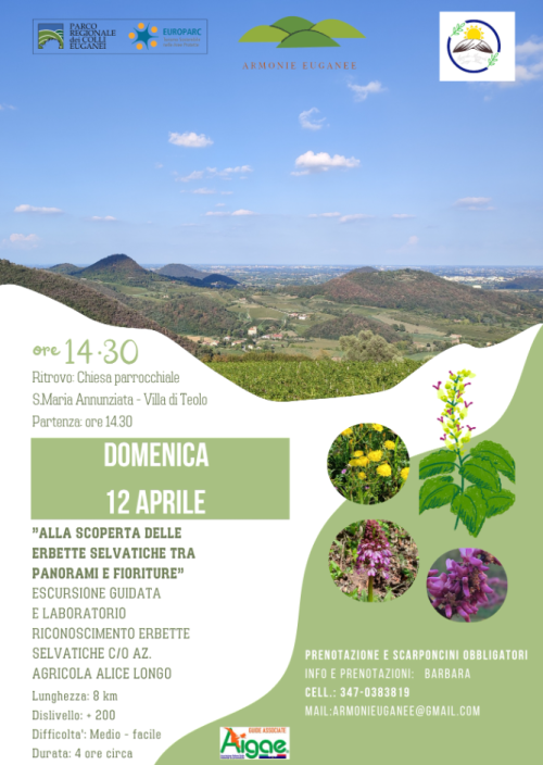 Percorso: Partendo dal centro parrocchiale di Villa di Teolo, attraverso il monte Vignola giungeremo in un punto panoramico del monte Arrigon da dove nelle giornate più terse lo sguardo sconfina verso la laguna veneta. Dopo una breve sosta, raggiungeremo l'azienda Agricola di Alice Longo che ci farà conoscere le erbette dei Colli Euganei.